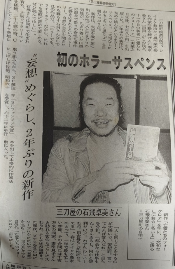 *注6(『亡霊たちのフォークロア』)石飛卓美先生インタビュー関連 『亡霊たちのフォークロア』の新聞での紹介記事 11作目の『亡霊たちのフォークロア』出版時の新聞記事椎茸農家にとって最も忙しい春。妻裕見子さんと訪れる客のもてなしにも大わらわの中、深夜ワープロを叩いて「妄想」を巡らし、三ヶ月かけた自信作とのこと!